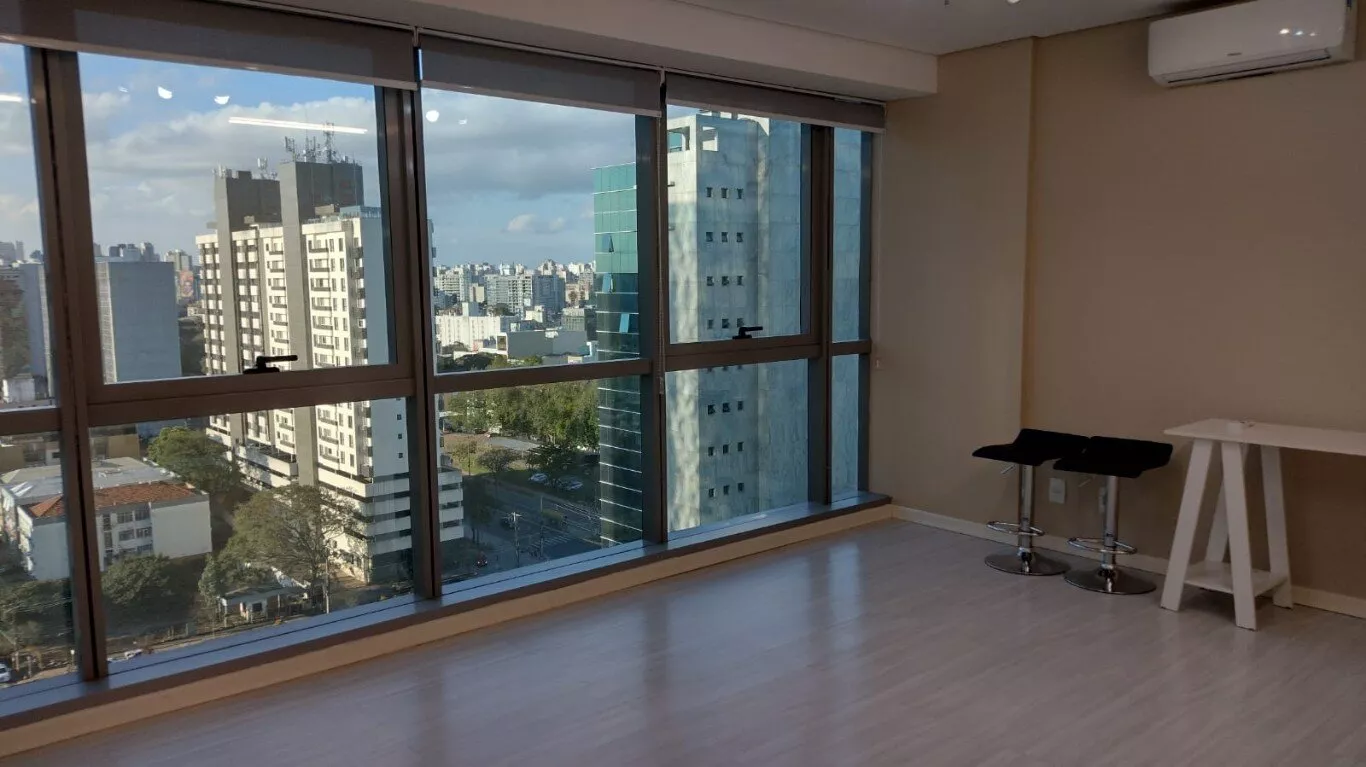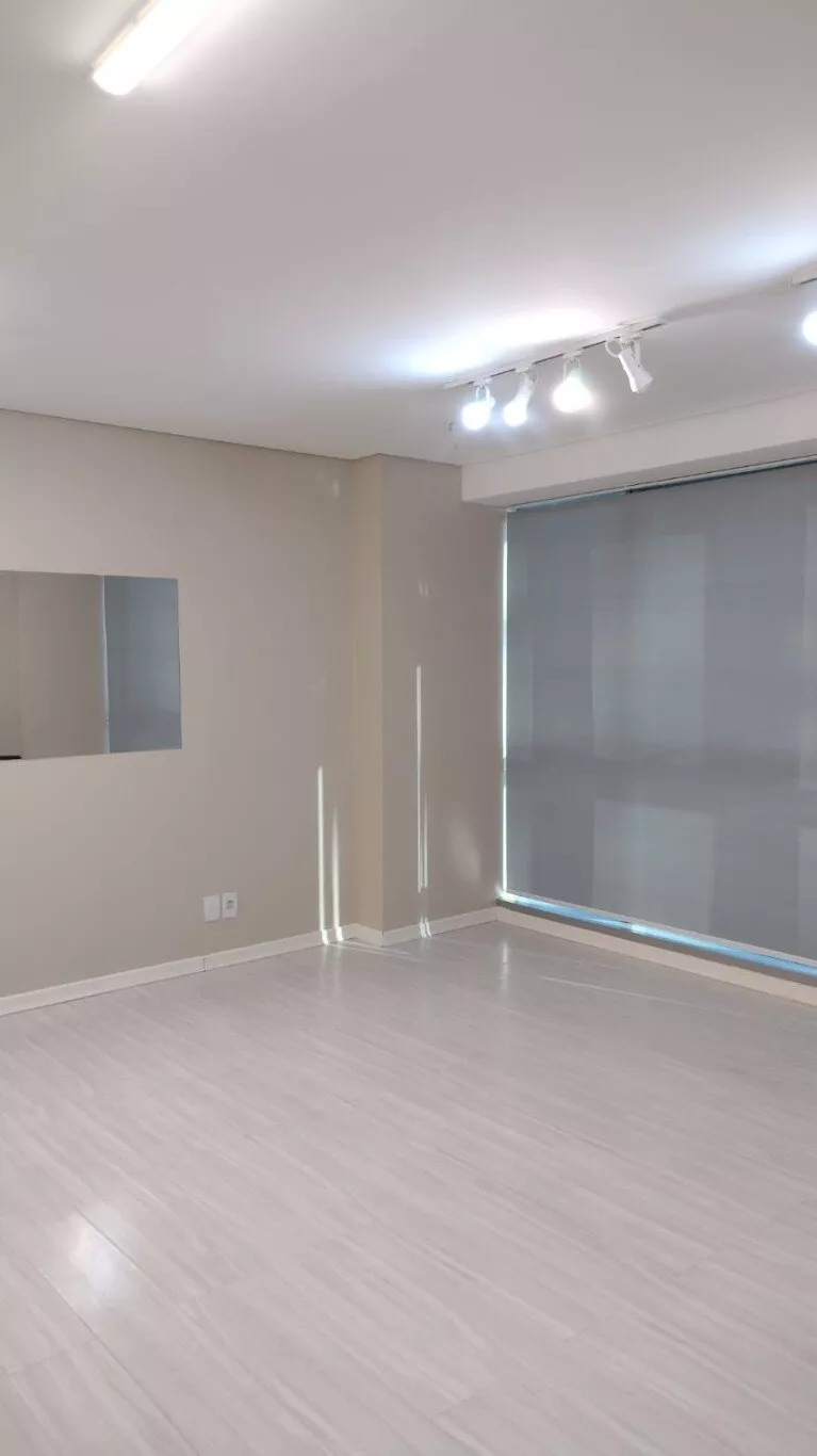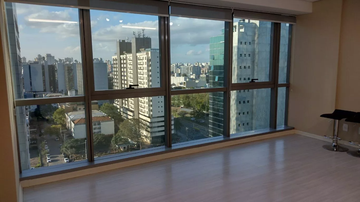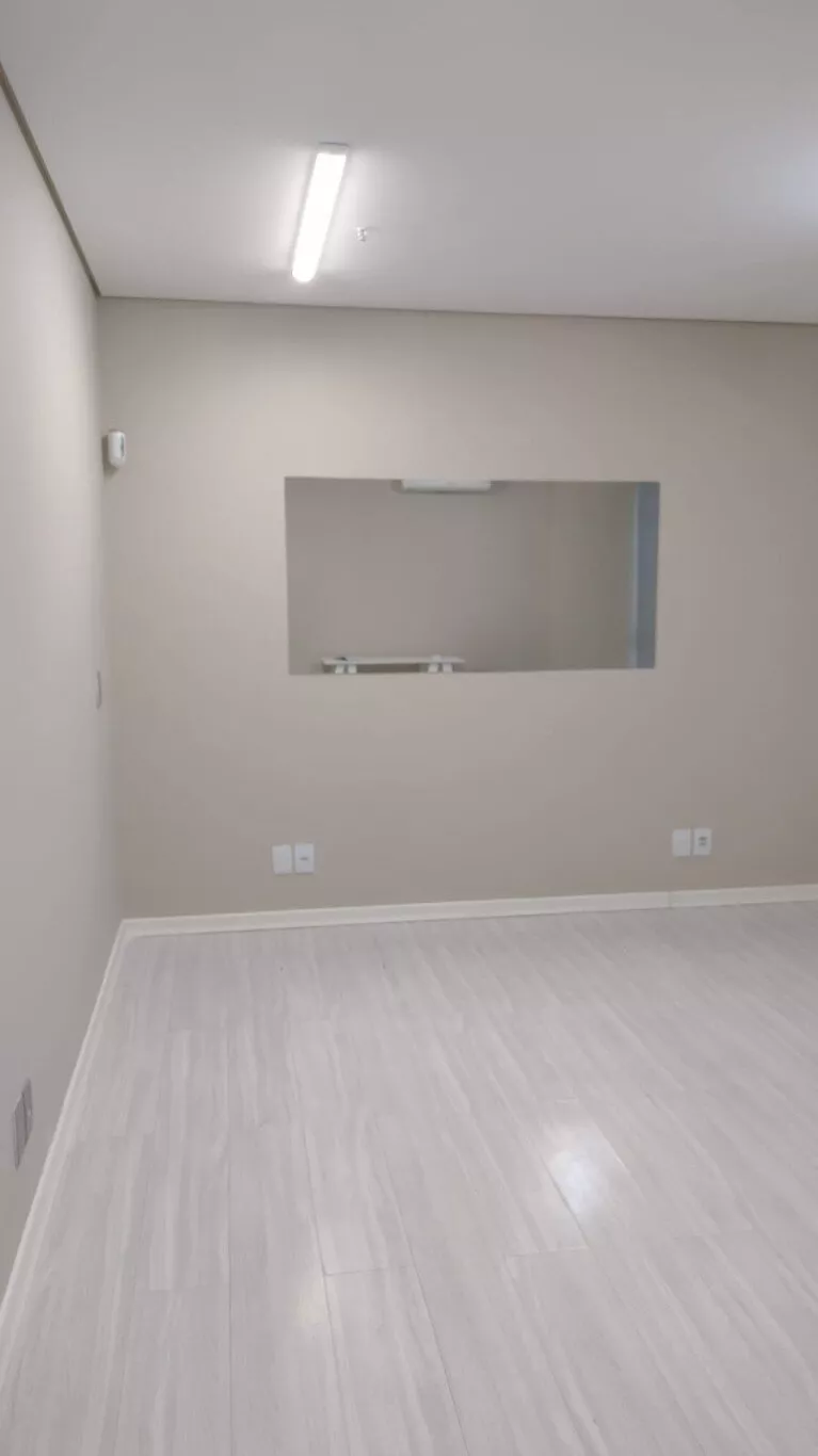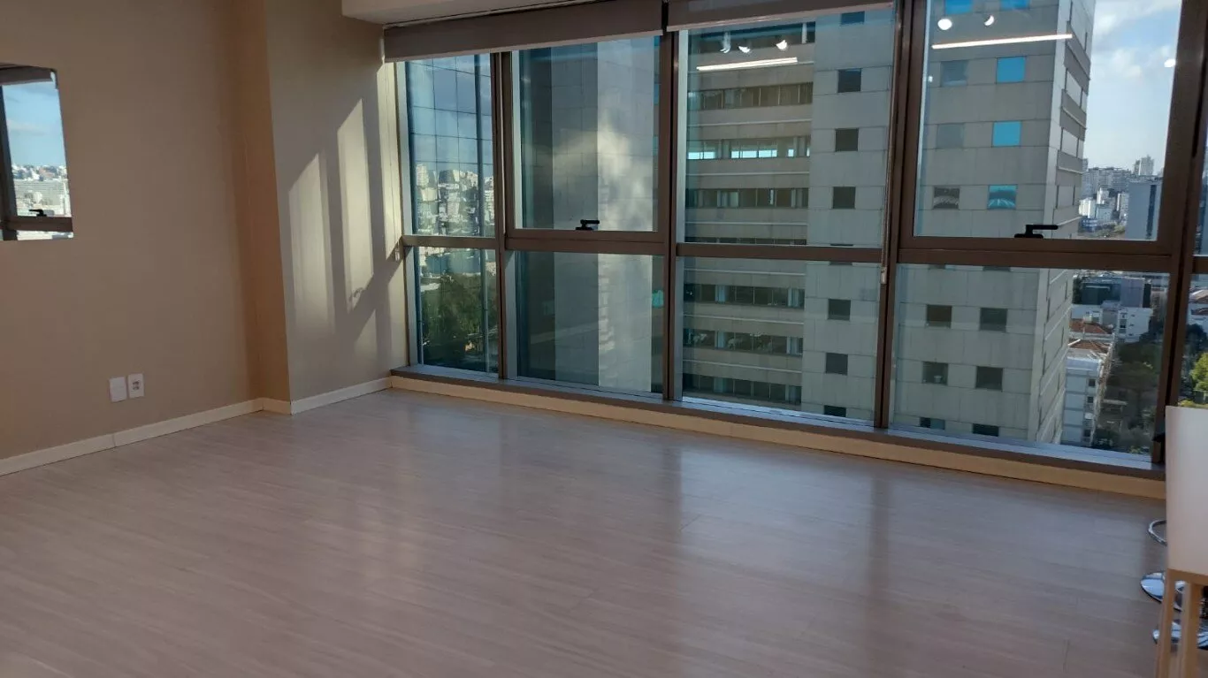 Excelente sala comercial, décimo terceiro andar, sol da manhã, com piso laminado, lumínárias, persianas, split novo instalado, banheiro com armário, com direito de uso de uma vaga de garagem.