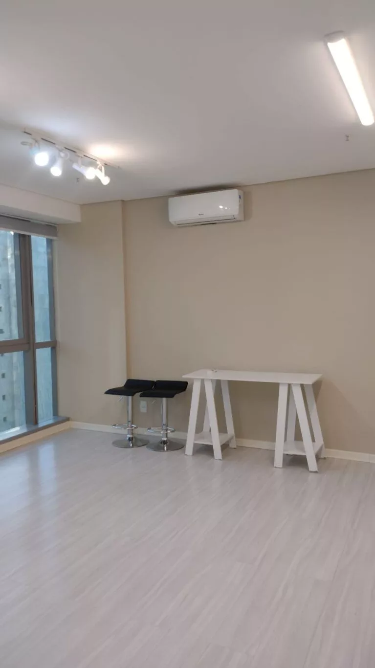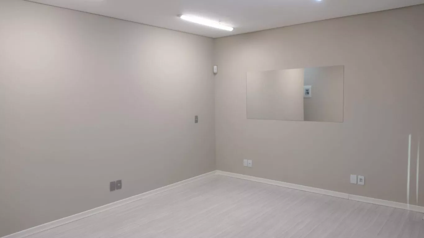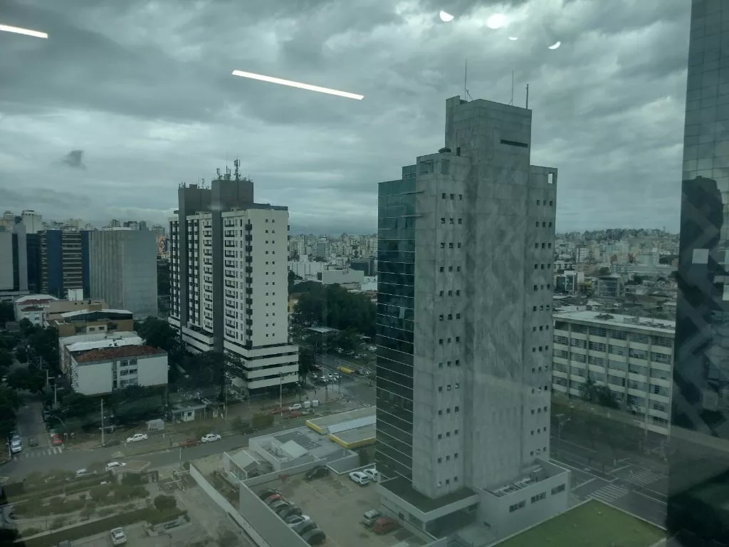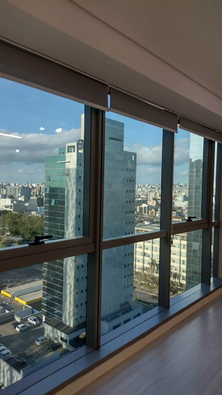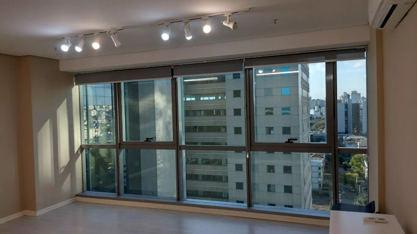 Excelente sala comercial, décimo terceiro andar, sol da manhã, com piso laminado, lumínárias, persianas, split novo instalado, banheiro com armário, com direito de uso de uma vaga de garagem.